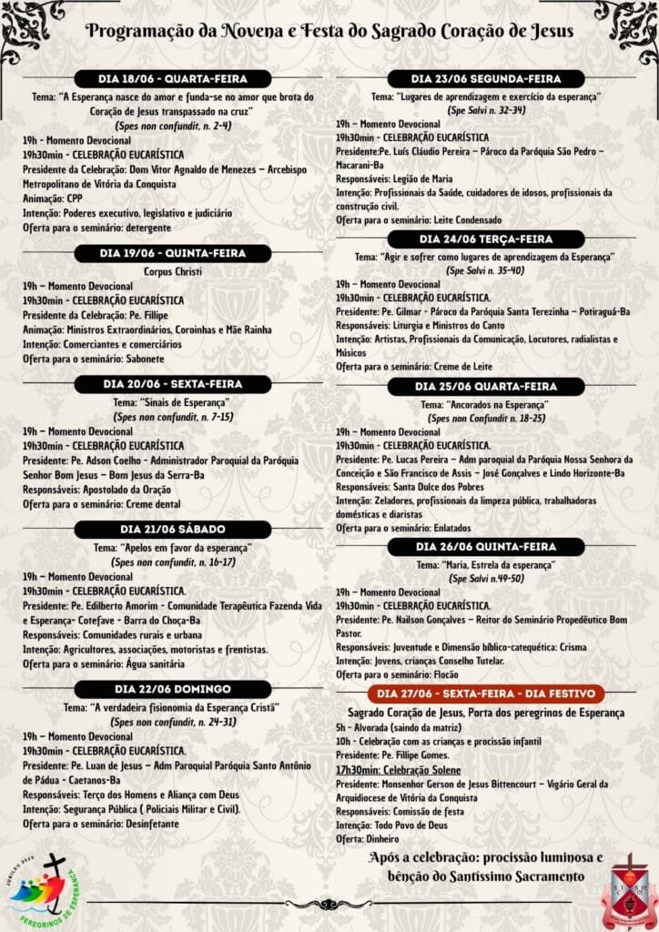 O Novenário e Festa tem como tema central: “Sagrado Coração de Jesus, porta dos Peregrinos de Esperança”. Para tanto, a programação contará com a participação do Arcebispo Metropolitano, Dom Vítor Agnaldo de Menezes, e diversos Presbíteros da Arquidiocese.