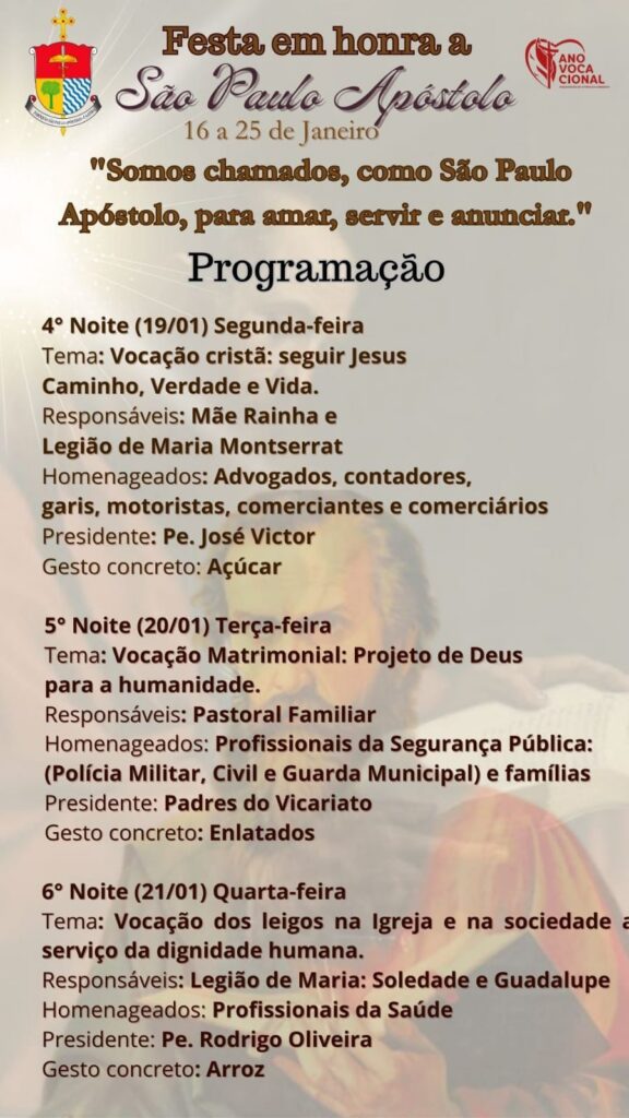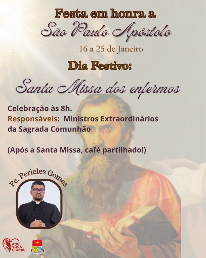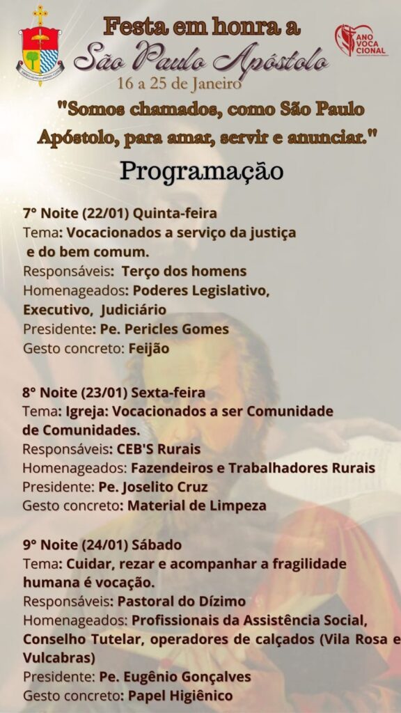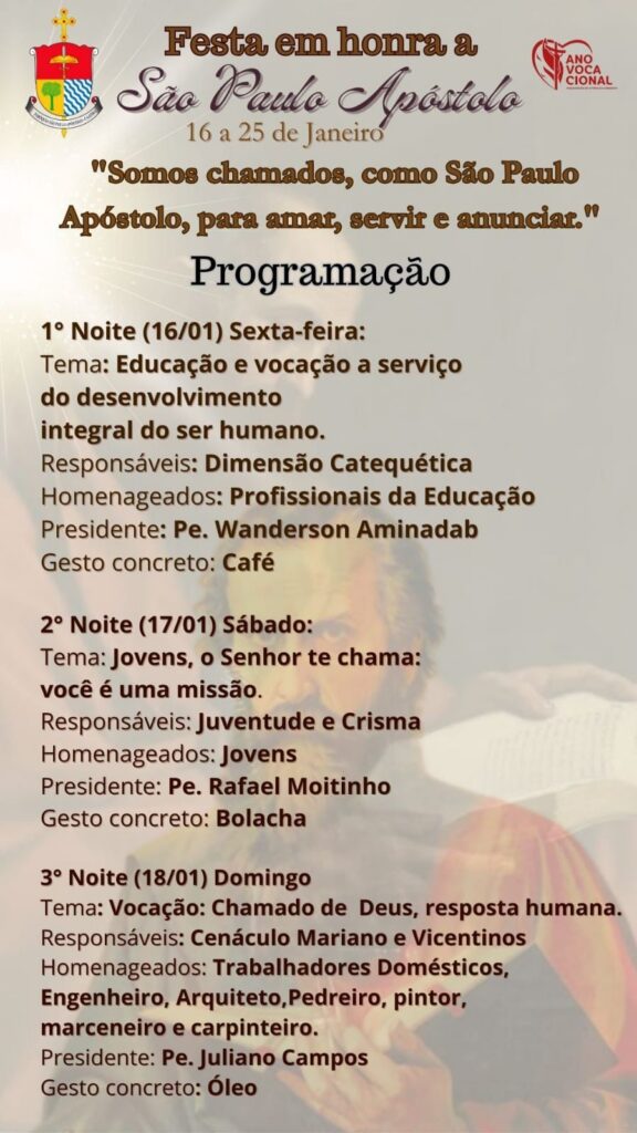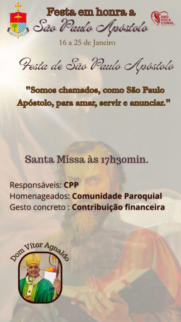 A Paróquia São Paulo Apóstolo, em Caatiba, realizará Novena e Festa em honra a seu Santo Padroeiro nos dias 16 a 25 de janeiro. A Festa tem como tema: “Somos chamados, como São Paulo Apóstolo, para amar, servir e anunciar”.