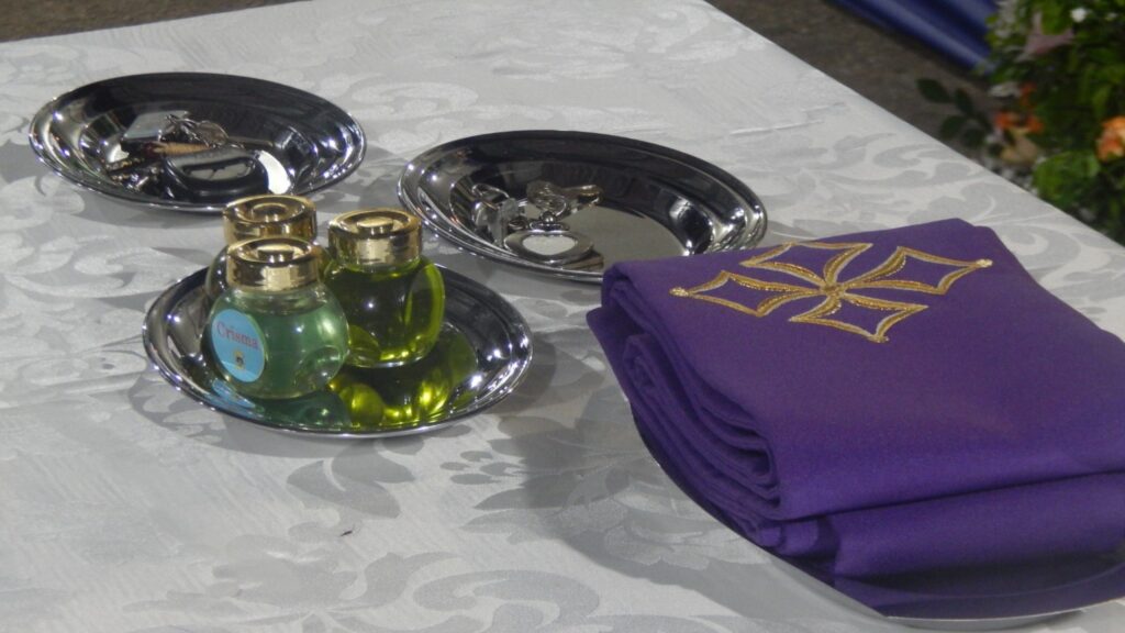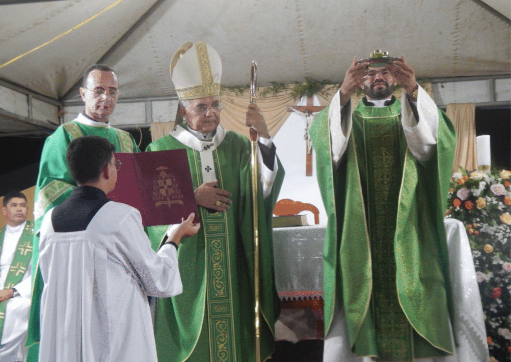 Na sequência do rito, o Pe. Dhonis fez sua Profissão de Fé diante do Arcebispo e da assembleia, assumindo, com liberdade e fidelidade, os compromissos do ministério que lhe foi confiado. Durante o rito de posse, Dom Vítor entregou ao novo pároco o Evangeliário, sinal de sua missão de anunciar, com coragem e fidelidade, a Palavra de Deus ao povo confiado à sua solicitude pastoral. Após a homilia, o sacerdote renovou suas promessas sacerdotais e recebeu as chaves da igreja e do sacrário, recordando que o pároco é chamado a ser homem da Palavra, da Eucaristia e do serviço. O juramento de fidelidade foi realizado e, ao sentar-se na sede presidencial, o Pe. Dhonis foi oficialmente declarado empossado, gesto que simboliza a autoridade pastoral exercida em comunhão com o Bispo.