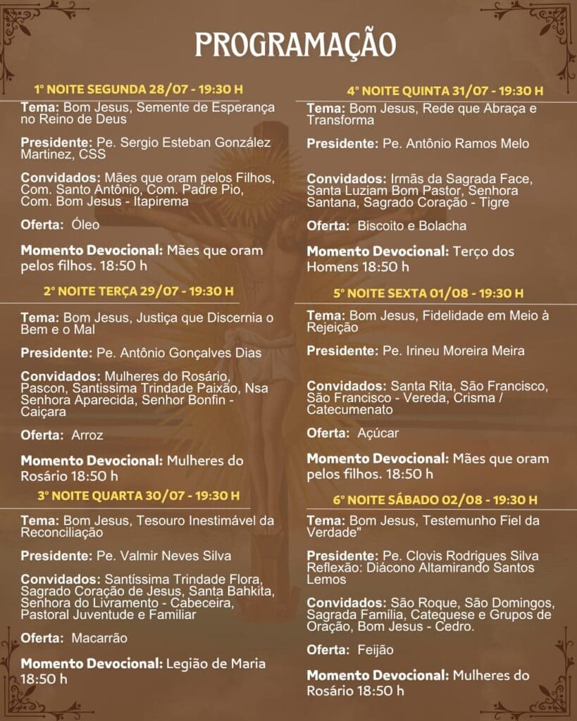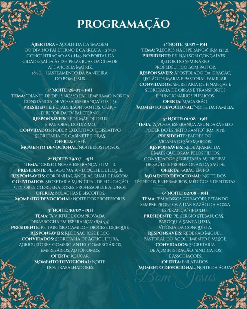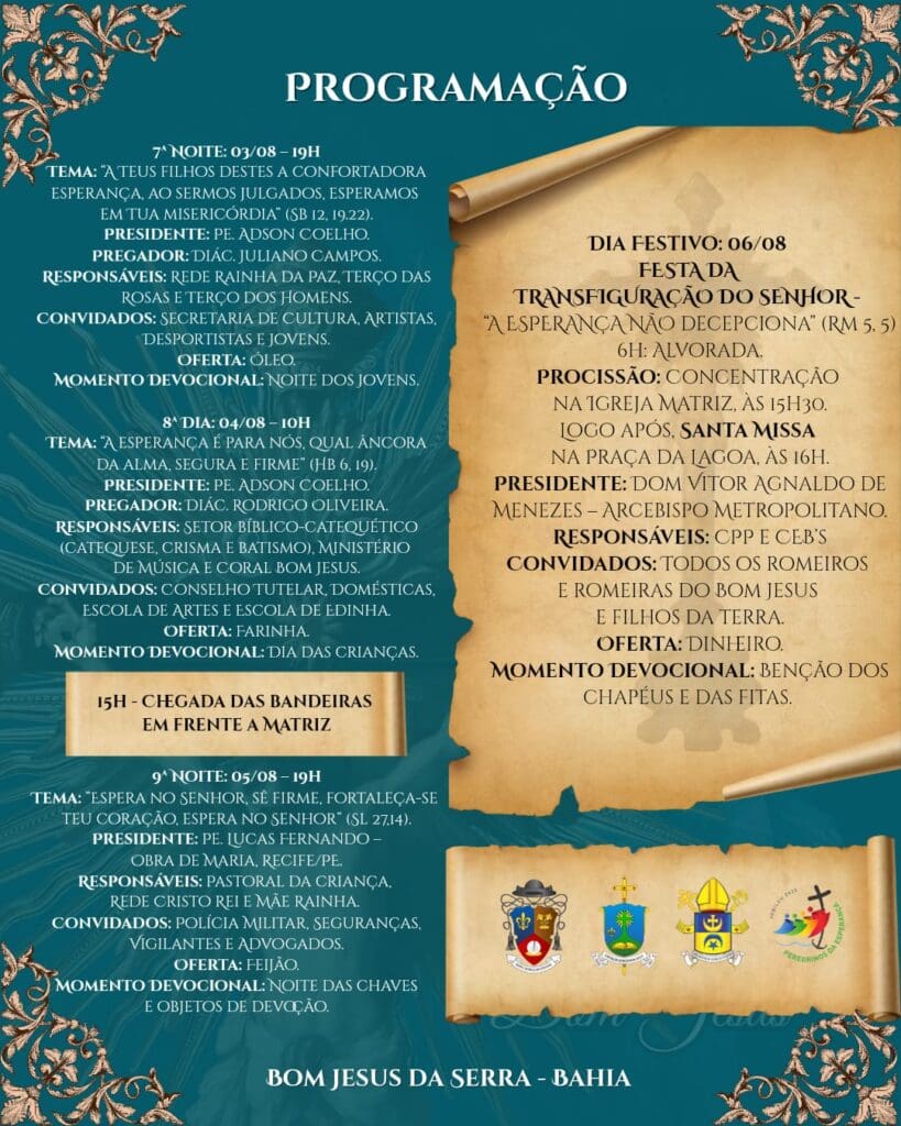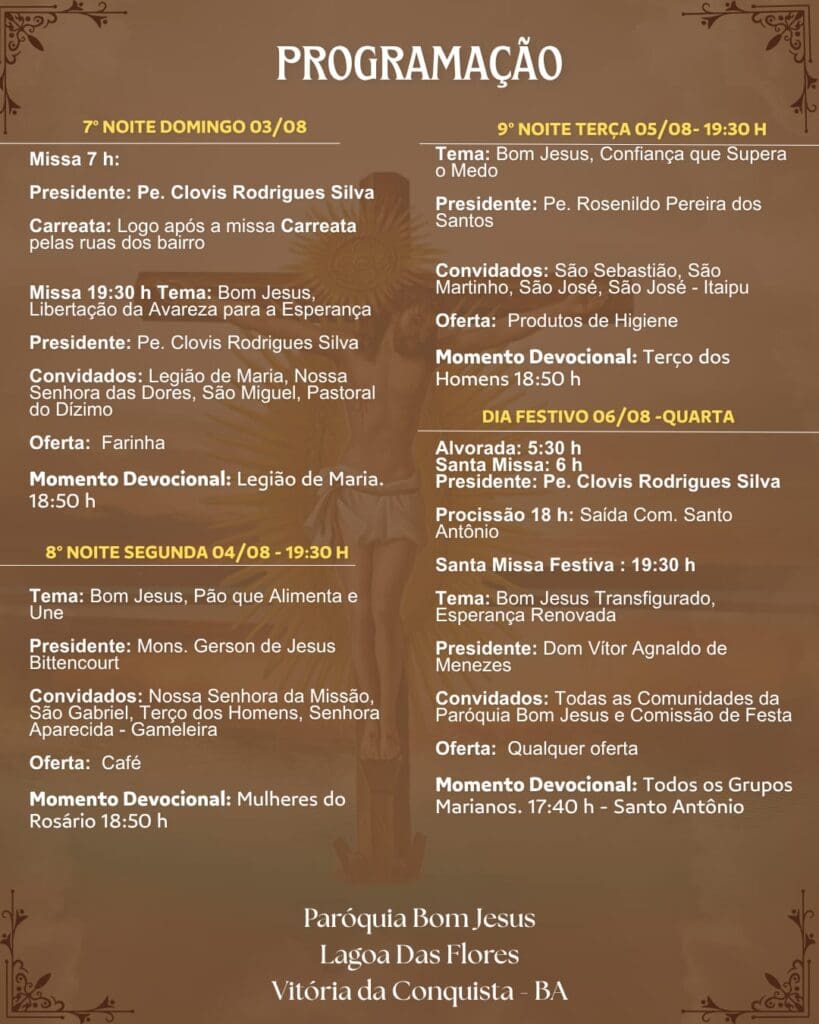As Paróquias Senhor Bom Jesus de Vitória da Conquista e da cidade de Bom Jesus da Serra, realizarão o Novenário e Festa em honra ao Senhor Bom Jesus. As Celebrações acontecerão entre os dias 28 de julho a 06 de agosto.