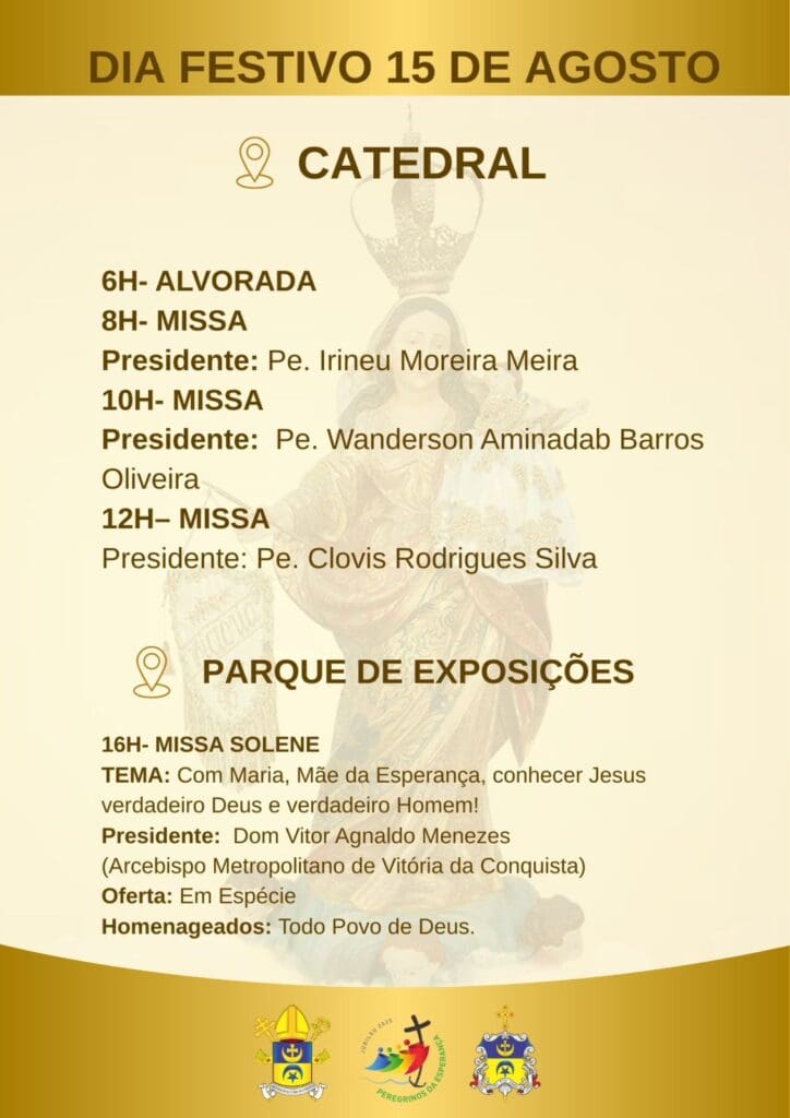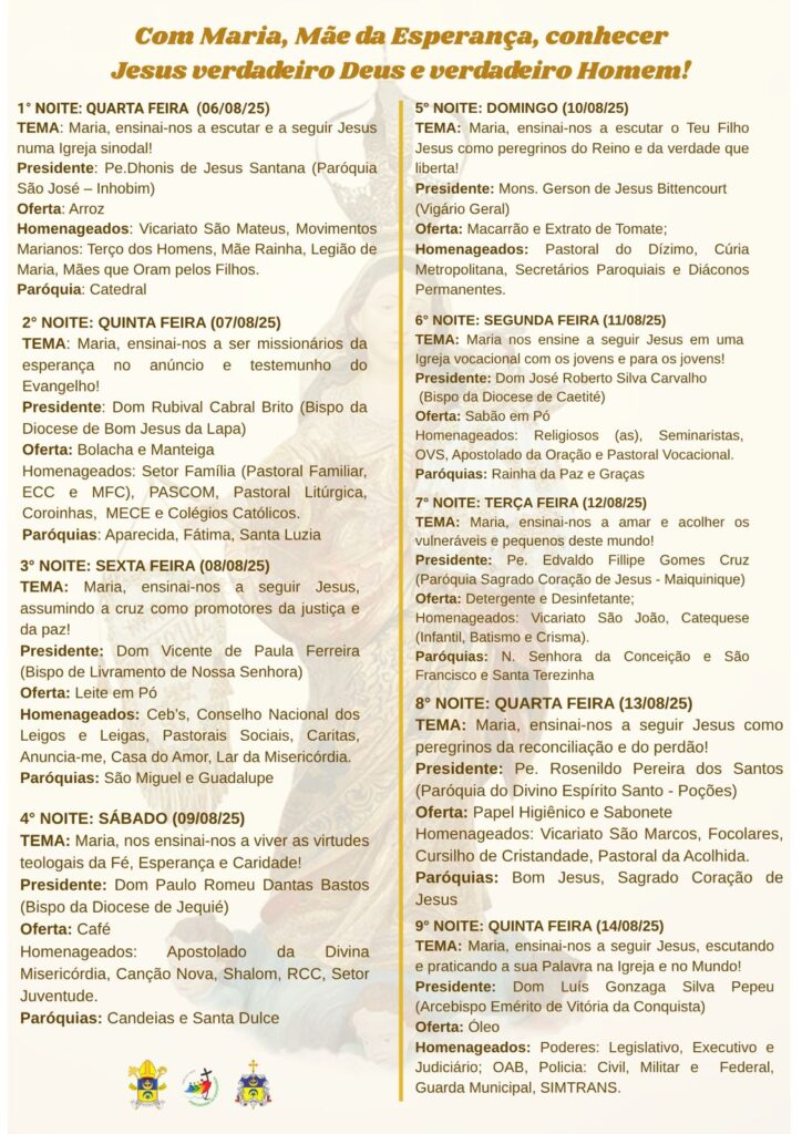 No próximo dia 06 à 15 de agosto, acontecerá o Novenário em honra a Nossa Senhora das Vitórias, Excelsa Padroeira da Arquidiocese de Vitória da Conquista. “Com Maria, Mãe da Esperança, conhecer Jesus verdadeiro Deus e verdadeiro Homem!” é o tema central da Novena desde ano de 2025.