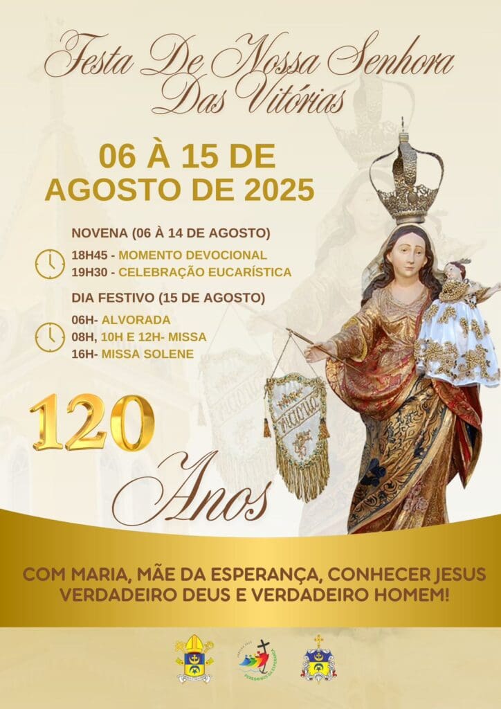 Este ano, a festividade ganha um significado especial, marcando os 120 anos que é celebrada a Festa de Nossa Senhora das Vitórias. Participemos com fé e devoção do Novenário e Festa da Padroeira da Arquidiocese.