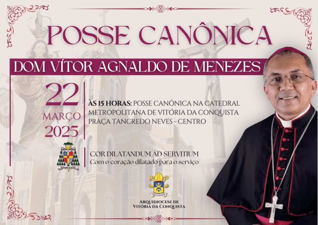 O novo Arcebispo de Vitória da Conquista, Dom Vítor Agnaldo de Menezes, tomará posse no próximo sábado, 22 de março de 2025, às 15h00, na Catedral Metropolitana Nossa Senhora das Vitórias, em Vitória da Conquista. Toda porção do Povo de Deus desta Arquidiocese está convidada para esse momento tão marcante na vida da Igreja local.