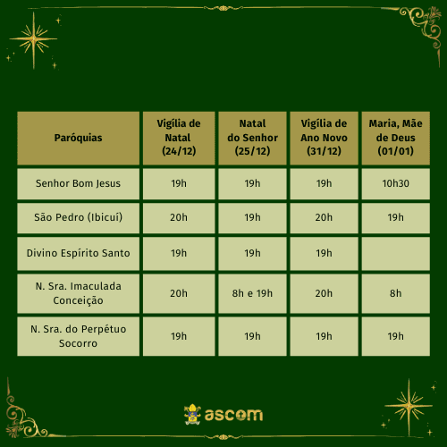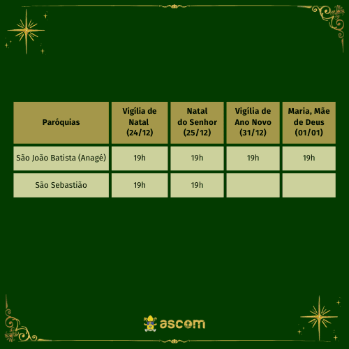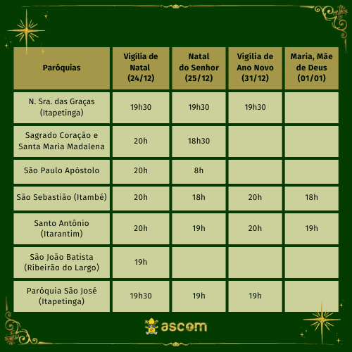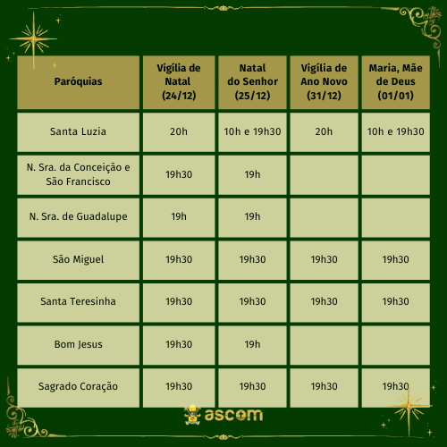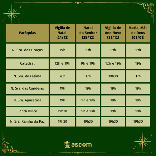 Confira a programação das Missas da Vigília de Natal, do Natal do Senhor e das Celebrações de ano novo, que acontecerão na Arquidiocese!
