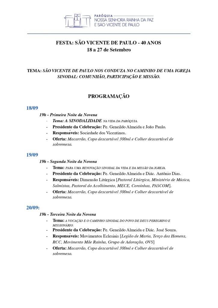 No próximo dia 18 de setembro a Paróquia Nossa Senhora Rainha da Paz e São Vicente de Paulo, em Vitória da Conquista, iniciará o Novenário em preparação para o Dia Festivo, 27/09, em Honra a São Vicente de Paulo.