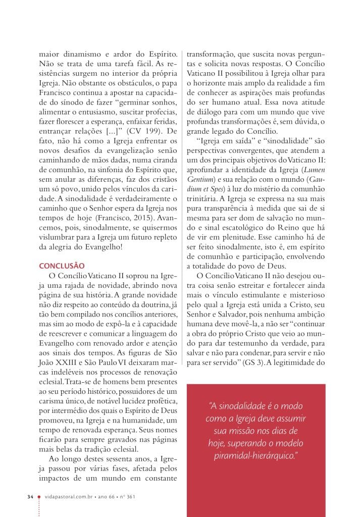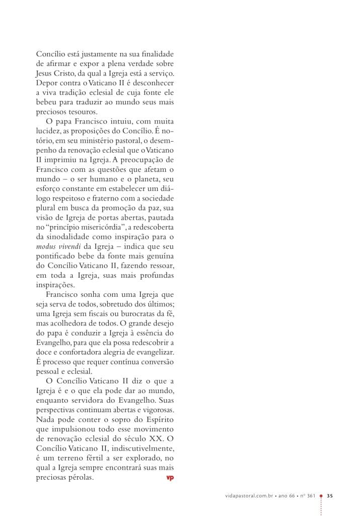 Numa perspectiva eclesiológico-pastoral, o texto aponta, em aspectos gerais, as ressonâncias do Concílio Vaticano II no pontificado do papa Francisco, objetivando reafirmar a legitimidade do Concílio e sua necessária aplicabilidade nos dias atuais, para que a Igreja continue a responder à sua missão na criatividade do Espírito, atenta aos sinais dos tempos.
