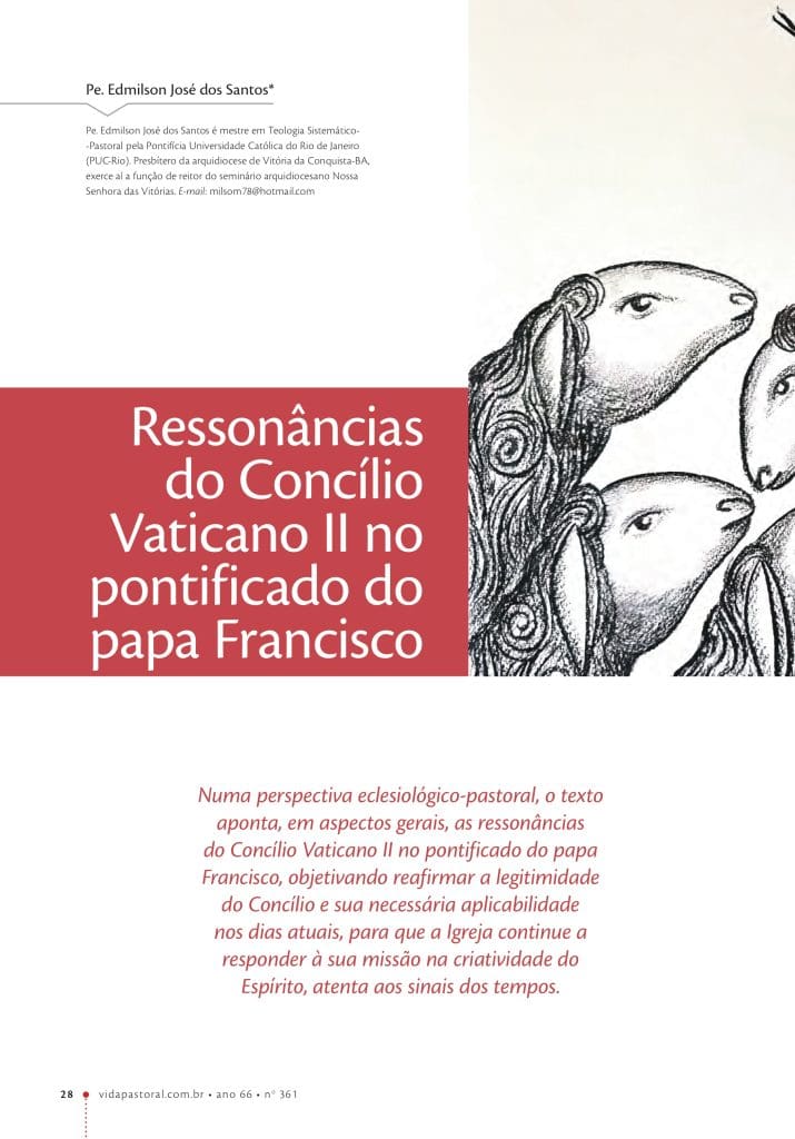 O Pe. Edmilson José dos Santos, que é mestre em Teologia Sistemático-Pastoral pela Pontifícia Universidade Católica do Rio de Janeiro (PUC-Rio) e Reitor do Seminário Arquidiocesano de Filosofia Nossa Senhora das Vitórias, teve um texto seu publicado recentemente na Revista Vida Pastoral, na edição atual, e o texto consiste em parte do seu trabalho de conclusão do mestrado. A revista Vida Pastoral da PAULUS é uma publicação bimestral, que contém artigos sobre teologia, espiritualidade, ética cristã, Patrística e outros temas, além de roteiros homiléticos em sintonia com o magistério da Igreja.