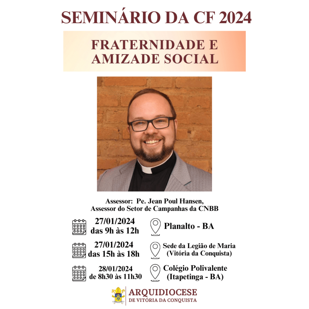 Nos próximos dias 27 e 28 de janeiro, acontecerá um importante evento Arquidiocesano. Visando o aprofundamento no tema da Campanha da Fraternidade proposto pela CNBB neste ano de 2024, a Arquidiocese de Vitória da Conquista, por meio da Coordenação de Pastoral, está promovendo o Seminário da CF 2024, que será dirigido pelo Pe. Jean Poul Hansen, que é o Assessor do Setor de Campanhas da CNBB.