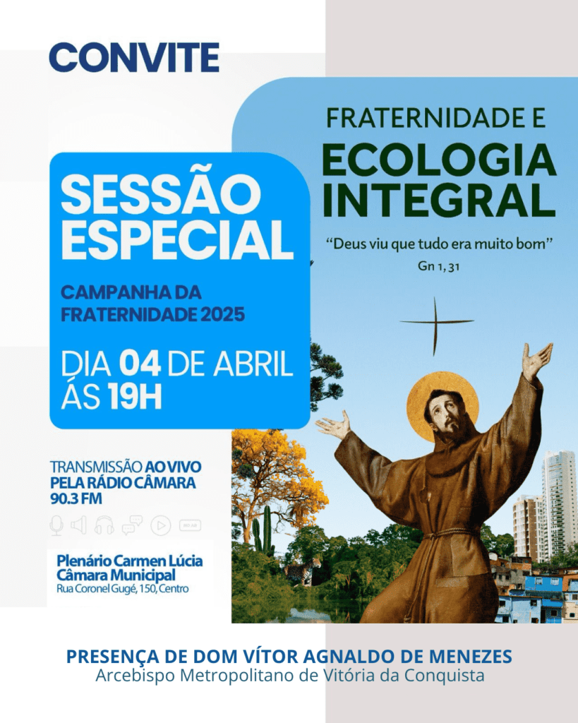 No próximo dia 4 de abril, a Câmara Municipal de Vitória da Conquista será palco de um evento significativo: a Sessão Especial da Campanha da Fraternidade 2025. A sessão, que terá início às 19h00, contará com a presença de Dom Vítor Agnaldo de Menezes, Arcebispo Metropolitano de Vitória da Conquista, e abordará o tema “Fraternidade e Ecologia Integral”.