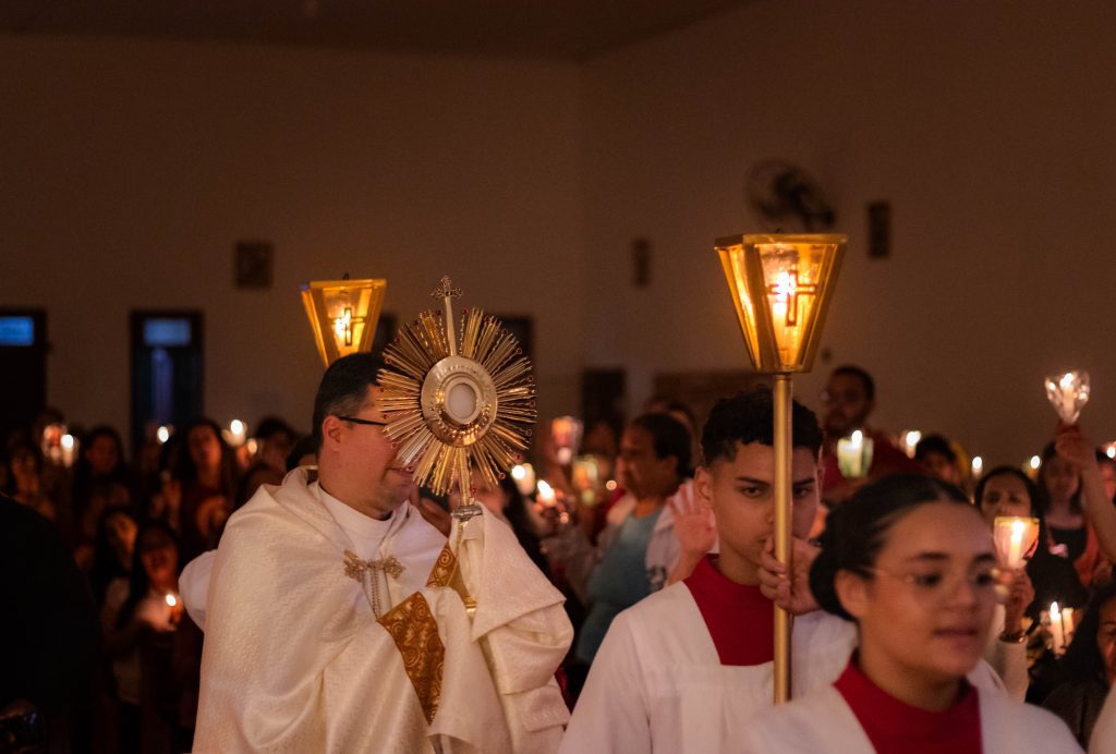 Nesta noite, sob o tema “Aprender a rezar com Jesus”, a Comunidade Paroquial mergulhou nas palavras e gestos de Jesus. O presidente da celebração e pregador foi o Pe. Gerson de Jesus Bittencourt, Pároco da Paróquia Nossa Senhora das Candeias e Administrador Arquidiocesano.