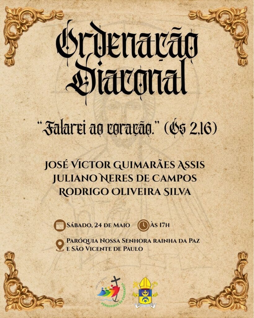 Todo o povo de Deus é convidado para participar da Santa Missa, com o Rito de Ordenação Diaconal na Paróquia Nossa Senhora Rainha da Paz e São Vicente de Paulo no sábado, dia 24 de maio, às 17h. A celebração será transmitida pelas redes sociais da Arquidiocese.