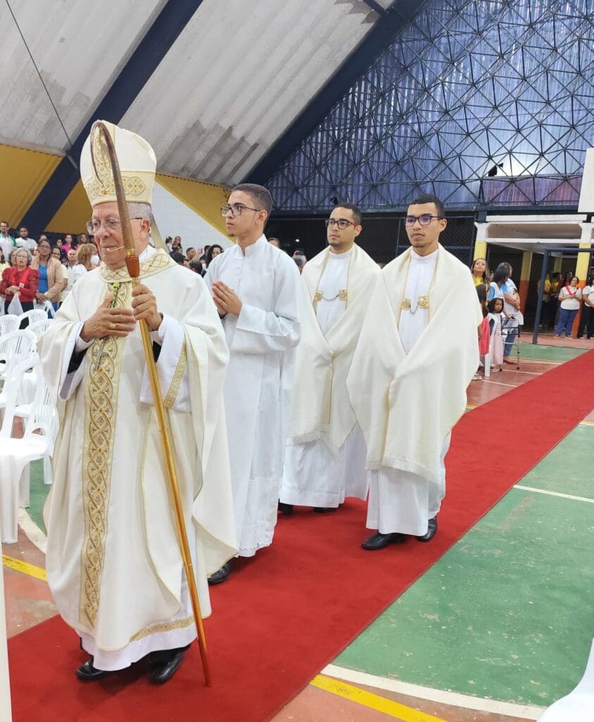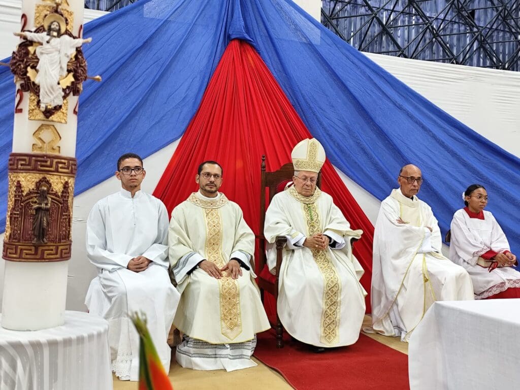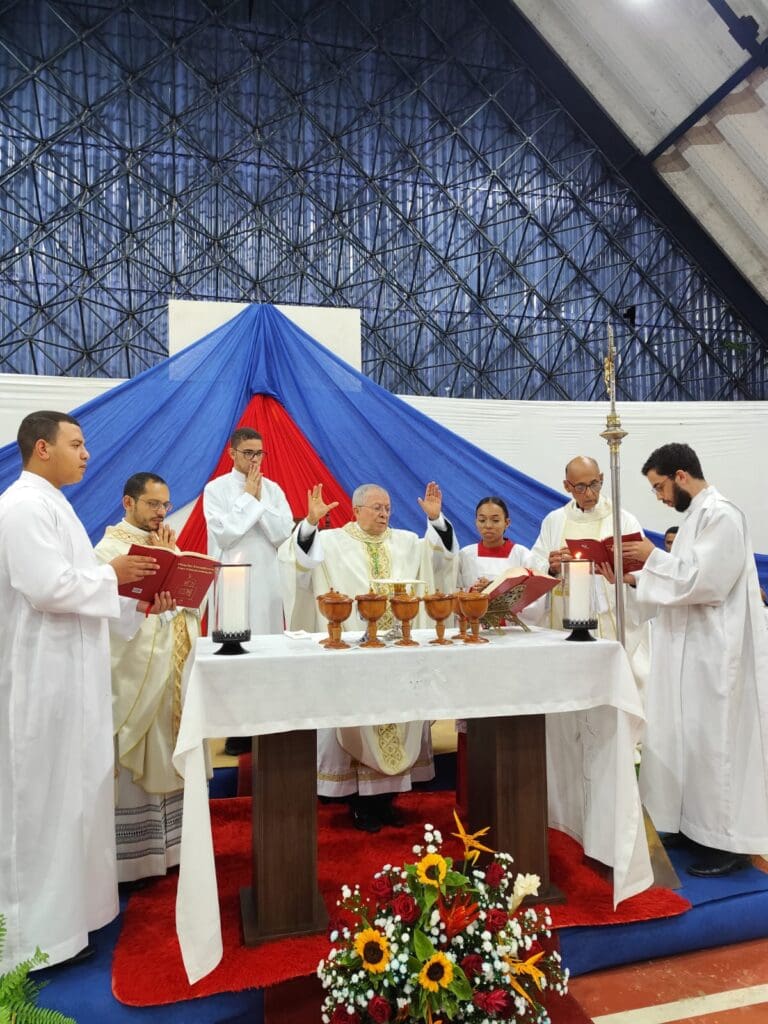 Neste domingo, 21 de abril, na quadra de esportes do colégio Paulo Hagge (CAIC), aconteceu a Celebração Eucarística solene, em honra do titular do Seminário Propedêutico, uma vez que este foi o 4º domingo do tempo pascal. A Santa Missa foi presidida pelo Administrador Apostólico da Arquidiocese, Dom Josafá Menezes da Silva, que em clima de muita festividade tratou sobre o tema “aprender a rezar com o Bom Pastor: ‘Senhor, ensina-nos a rezar’. Estavam concelebrando, os Padres Nailson e Uilton. Além deles, os Seminaristas Propedeutas, que também acompanharam o Tríduo, e alguns Seminaristas da Filosofia participaram e serviram na celebração festiva.