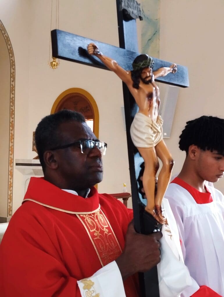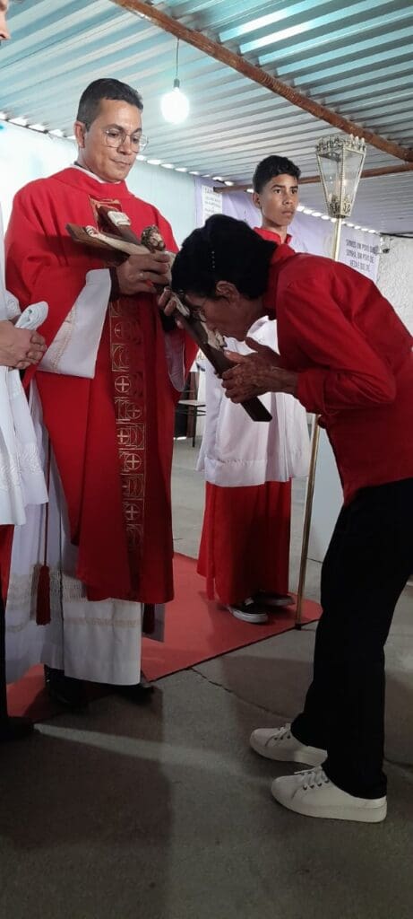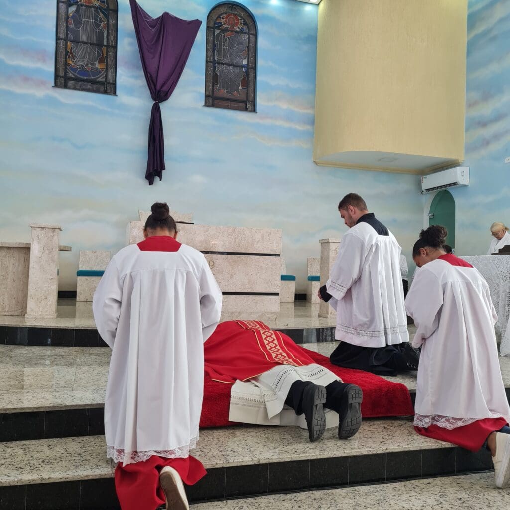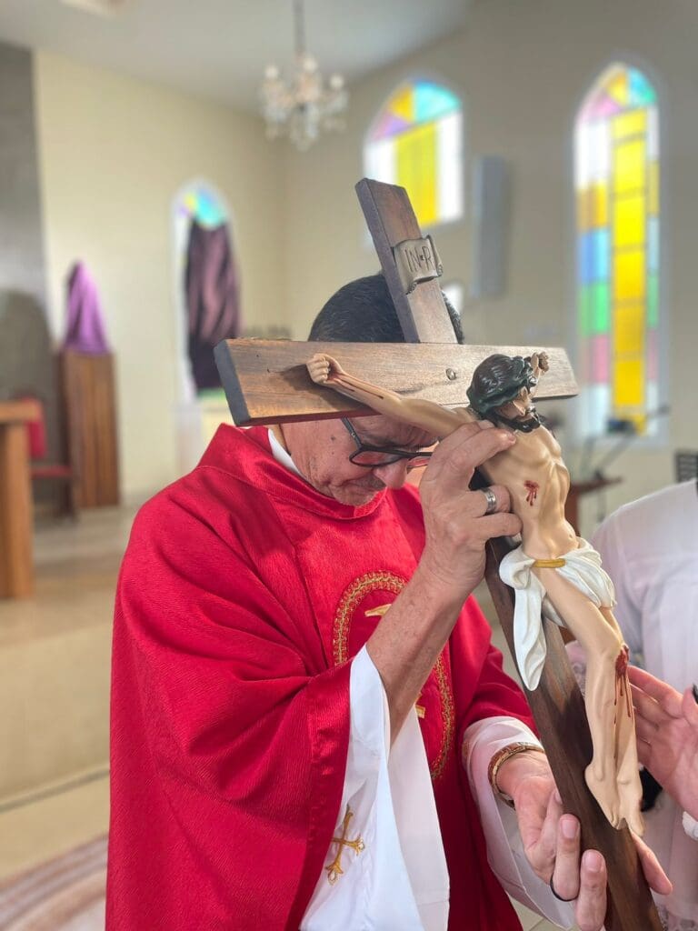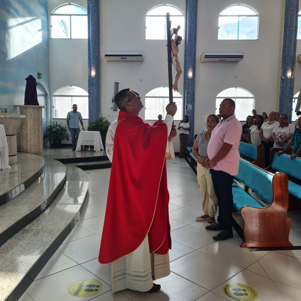 O segundo dia do Tríduo Pascal é a celebração da Paixão do Senhor, na Sexta-feira da Semana Santa. Sempre se celebra às quinze horas, no momento em que Ele deu sua vida por nós! Não há celebração da eucaristia neste dia. Tudo em silêncio. É dia de jejum. Os bispos, padres e diáconos entram em procissão e, diante do altar, se prostram no silêncio. Depois, temos as leituras, que são profundas e significativas. Seguem-se a Oração Universal. Ainda, temos o momento da ‘Adoração da cruz’. Aqui o presidente da celebração canta: ‘Eis o lenho da cruz, do qual pendeu a salvação do mundo!’ E todo o povo responde: ‘Vinde, adoremos’. É o momento da celebração e adoração da cruz de Cristo, que deu sua vida por nós. Enfim, temos a comunhão eucarística, que se arruma o altar para esta finalidade. Depois o altar volta à sua normalidade. Este é um dia diferente, de mais silêncio, de maior oração e, nosso coração deve estar mais aberto a perdoar tudo o que for necessário.