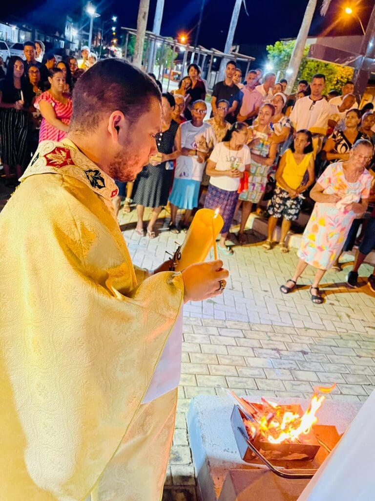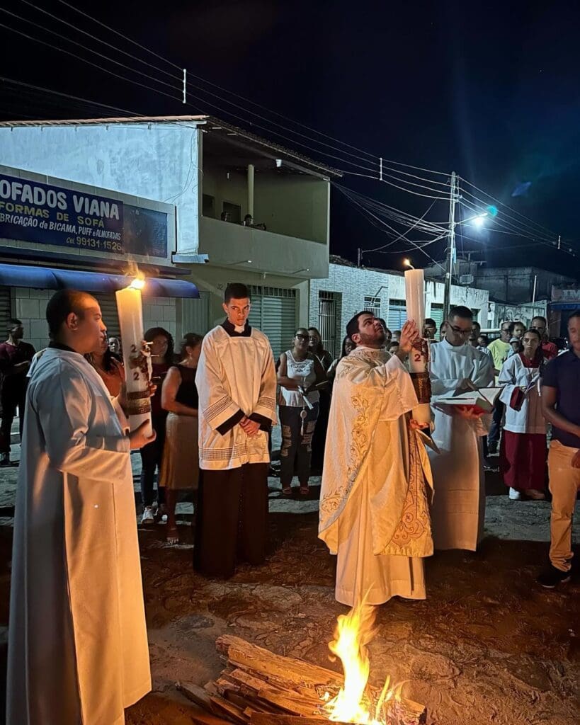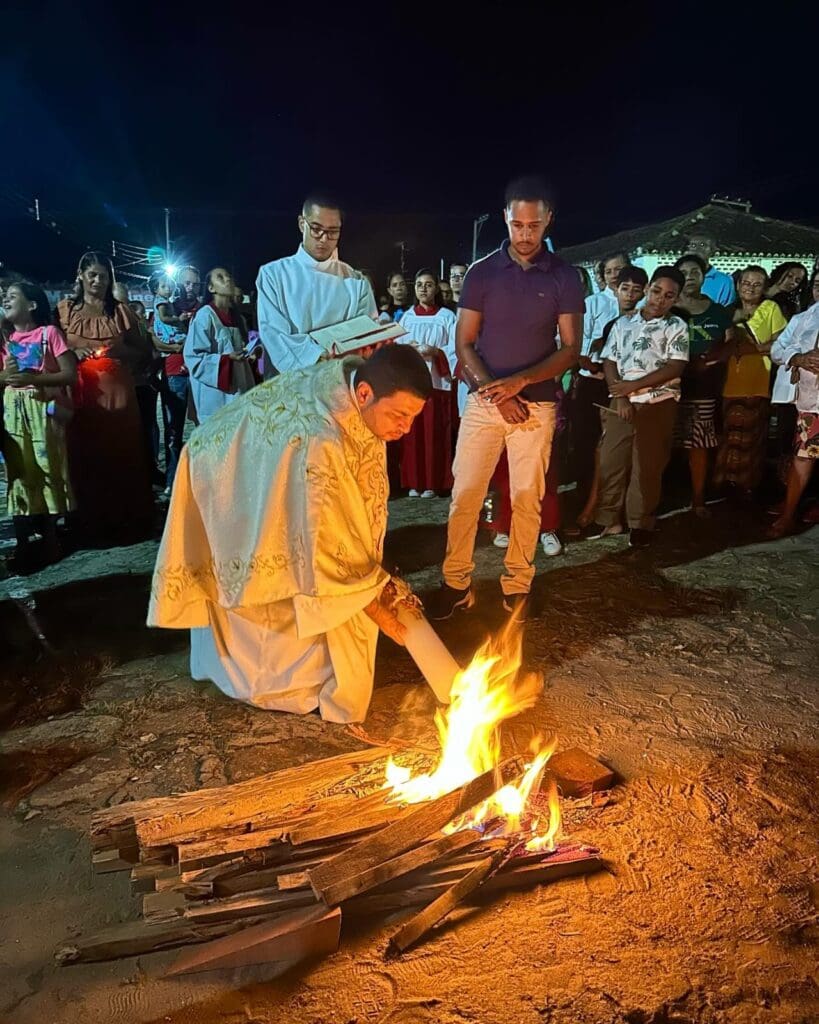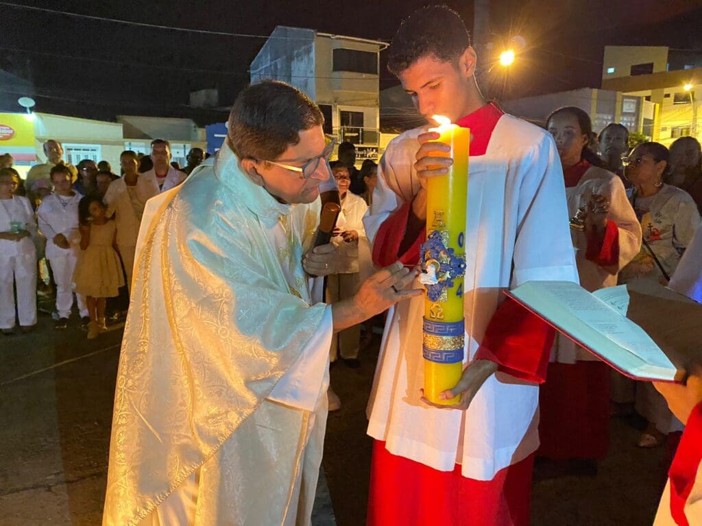O terceiro dia, o ‘Grande Sábado’ ou Vigília Pascal na Noite Santa, recordemos Jesus Cristo que ressuscita. Já é noite! ‘Que está acontecendo hoje? Um grande silêncio reina sobre a terra. Um grande silêncio e uma grande solidão. Um grande silêncio, porque o Rei está dormindo; a terra estremeceu e ficou silenciosa, porque o Deus feito homem adormeceu e acordou os que dormiam há séculos. Deus morreu na carne e despertou a mansão dos mortos’ (Antiga homilia do Grande Sábado Santo). Vivemos o sábado, em primeiro lugar, silencioso. Tudo nos fala muito. Antes de tudo, iniciamos fora da Igreja. Faz-se o acendimento do Círio Pascal, acompanhado das velas, com três vezes sendo cantado: ‘Eis a luz de Cristo!’ e o povo responde: ‘Demos graças a Deus’. Depois, temos uma série longa da liturgia da palavra, são nove leituras e nove salmos diferentes. Fazemos com calma, sem pressa. Depois, temos a Liturgia Batismal, caso tenham sido preparados. Ainda a Bênção da Água Batismal. Depois, solenemente, elevamos a Deus Pai, nossa gratidão, pela Liturgia Eucarística. Hoje, é dia de Páscoa!” (BARUFFI, Dom Adelar. O tríduo pascal e a Páscoa de Jesus Cristo. 2023. Disponível em: < https://www.cnbb.org.br/o-triduo-pascal-e-a-pascoa-de-jesus-cristo/> Acesso em: 01 abril 2024.)