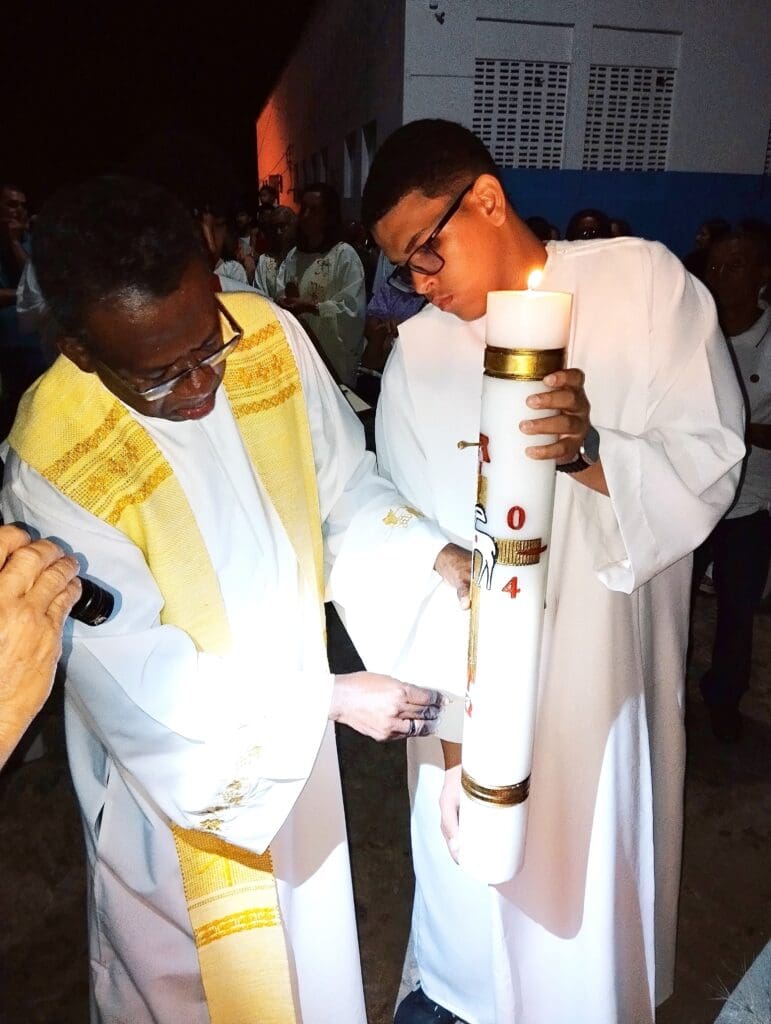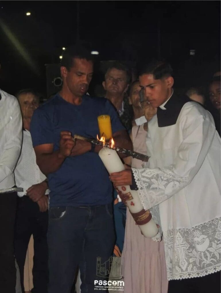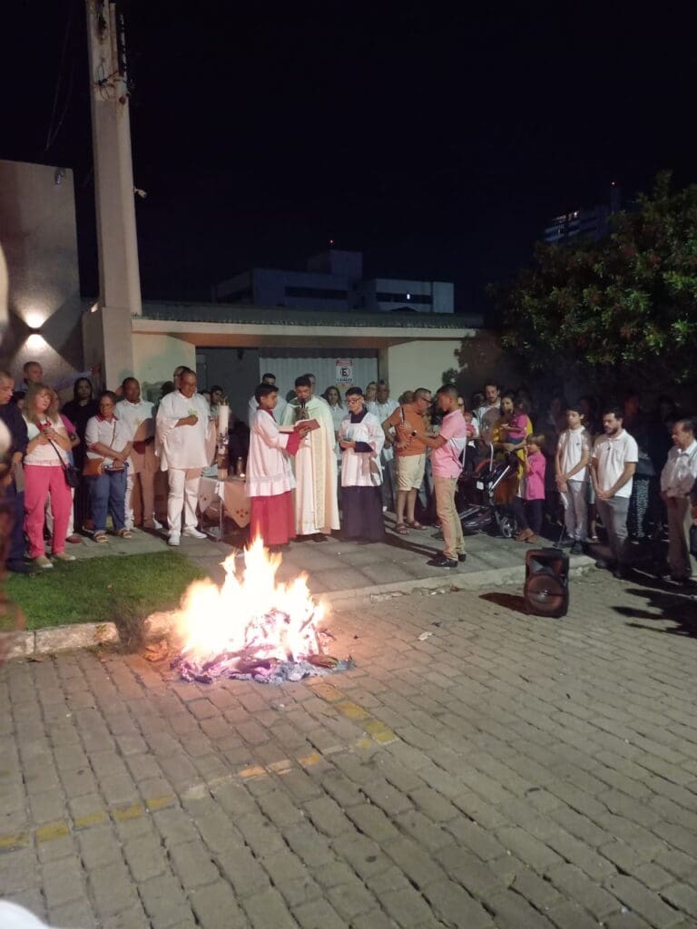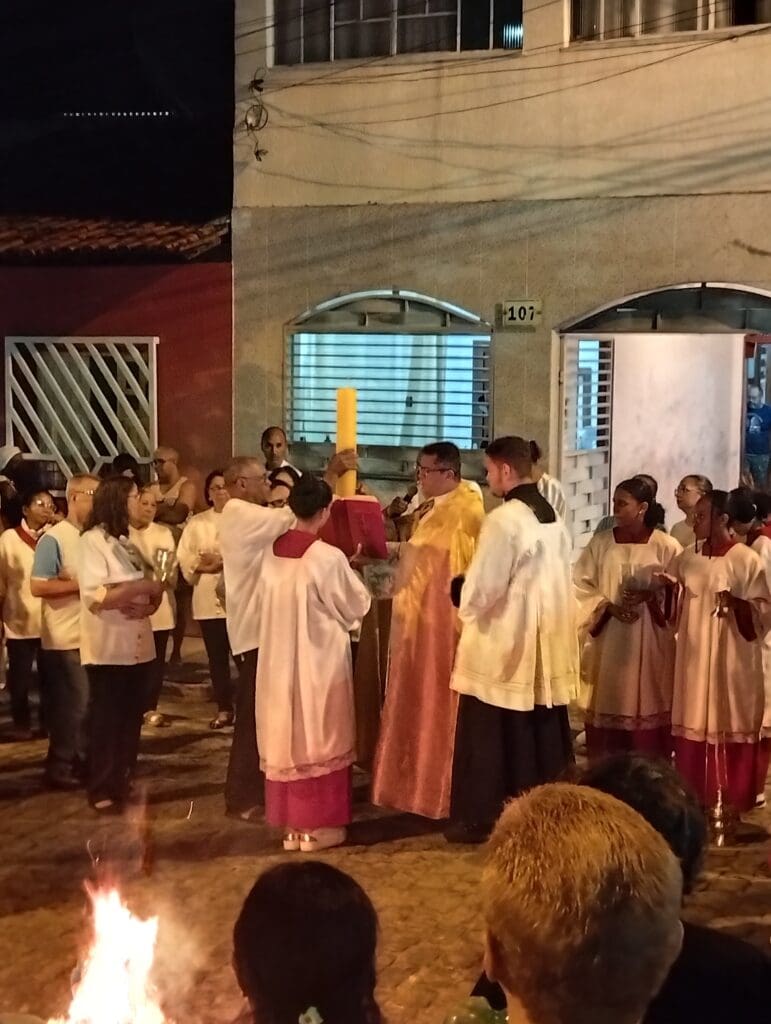 O terceiro dia, o ‘Grande Sábado’ ou Vigília Pascal na Noite Santa, recordemos Jesus Cristo que ressuscita. Já é noite! ‘Que está acontecendo hoje? Um grande silêncio reina sobre a terra. Um grande silêncio e uma grande solidão. Um grande silêncio, porque o Rei está dormindo; a terra estremeceu e ficou silenciosa, porque o Deus feito homem adormeceu e acordou os que dormiam há séculos. Deus morreu na carne e despertou a mansão dos mortos’ (Antiga homilia do Grande Sábado Santo). Vivemos o sábado, em primeiro lugar, silencioso. Tudo nos fala muito. Antes de tudo, iniciamos fora da Igreja. Faz-se o acendimento do Círio Pascal, acompanhado das velas, com três vezes sendo cantado: ‘Eis a luz de Cristo!’ e o povo responde: ‘Demos graças a Deus’. Depois, temos uma série longa da liturgia da palavra, são nove leituras e nove salmos diferentes. Fazemos com calma, sem pressa. Depois, temos a Liturgia Batismal, caso tenham sido preparados. Ainda a Bênção da Água Batismal. Depois, solenemente, elevamos a Deus Pai, nossa gratidão, pela Liturgia Eucarística. Hoje, é dia de Páscoa!” (BARUFFI, Dom Adelar. O tríduo pascal e a Páscoa de Jesus Cristo. 2023. Disponível em: < https://www.cnbb.org.br/o-triduo-pascal-e-a-pascoa-de-jesus-cristo/> Acesso em: 01 abril 2024.)