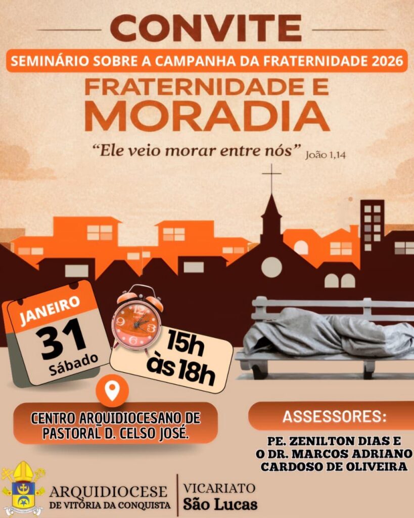No dia 31 de janeiro, o Vicariato São Lucas irá realizar o Seminário sobre a Campanha da Fraternidade 2026, em Vitória da Conquista. Para este ano, o tema a ser trabalhado será: “Fraternidade e Morada: Ele veio morar entre nós (João 1,14)”.